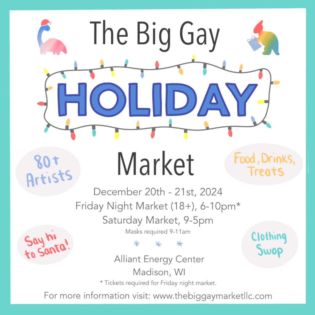 First of all, on December 20th and 21st, I’ll be part of The Big Gay Holiday Market, in Madison, WI. I’m so excited to be part of this event! I hope that if you’re anywhere near Madison, you’ll consider coming out to support me and others in the market.